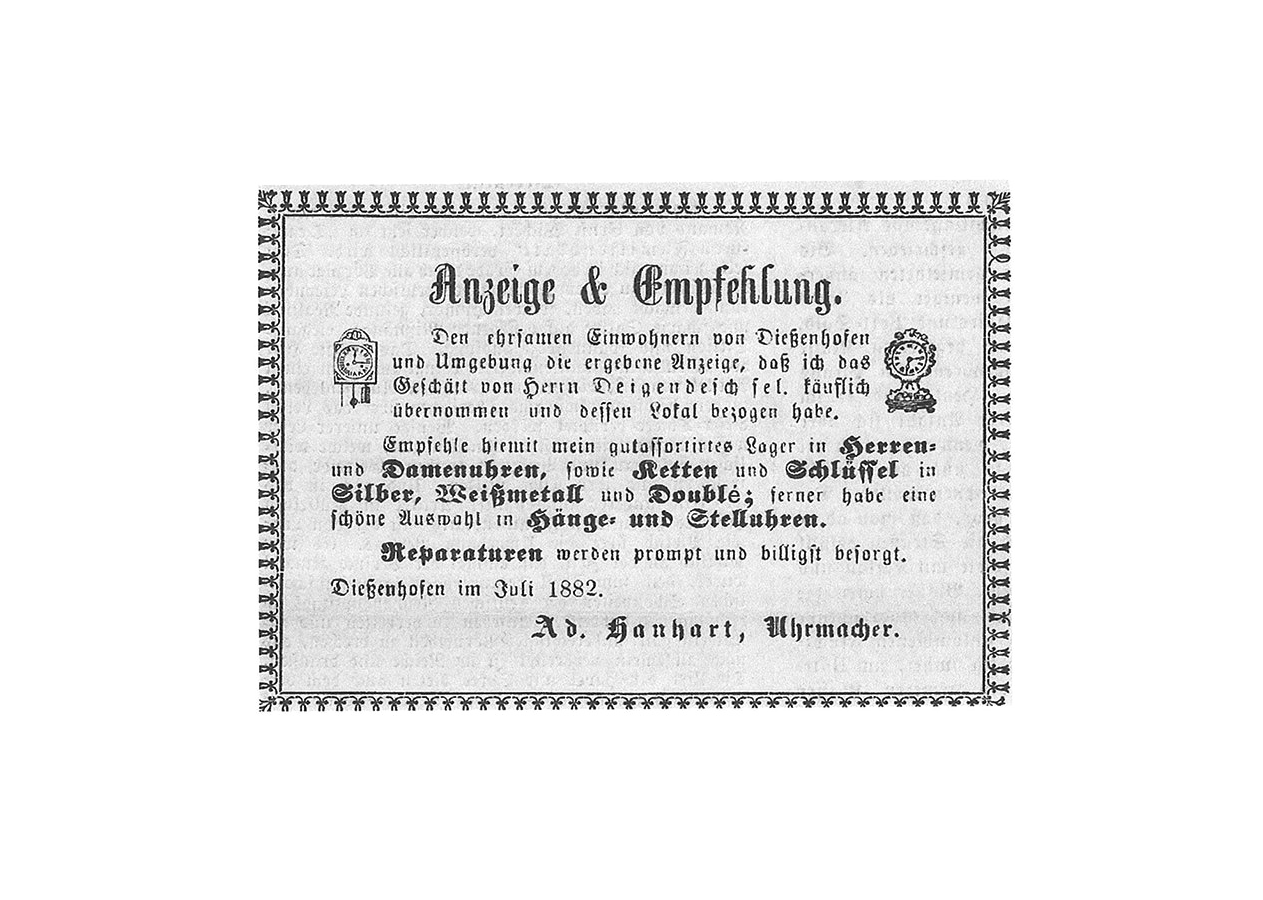 1882年7月1日、スイス北東部、ライン川沿いの小さな町ディッセンホーフェン。夕焼けが町を包むころ、一人の時計職人が机に向かってペンを走らせていました。彼の名はヨハン・アドルフ・ハンハルト。この日、彼は大きな決意を胸に、地元紙に載せる文を書き上げます。「ディッセンホーフェンおよび近隣にお住まいの皆さまへ、謹んでお知らせいたします」そう始まるその告知には、ハウプト通り33番地にある店舗を購入し、時計店を開業したことが記されていました。彼の思いが詰まったこの小さな一歩が、やがて長い歴史へとつながっていくのです。1856年5月11日、ディッセンホーフェンで生まれたヨハン・アドルフ・ハンハルトは、職人としての腕を磨くだけでなく、後に町の議長を務めるなど、地域の信頼を集める人物でもありました。小さな町の一角で始まったHANHARTの物語は、ここから静かに動き出したのです。