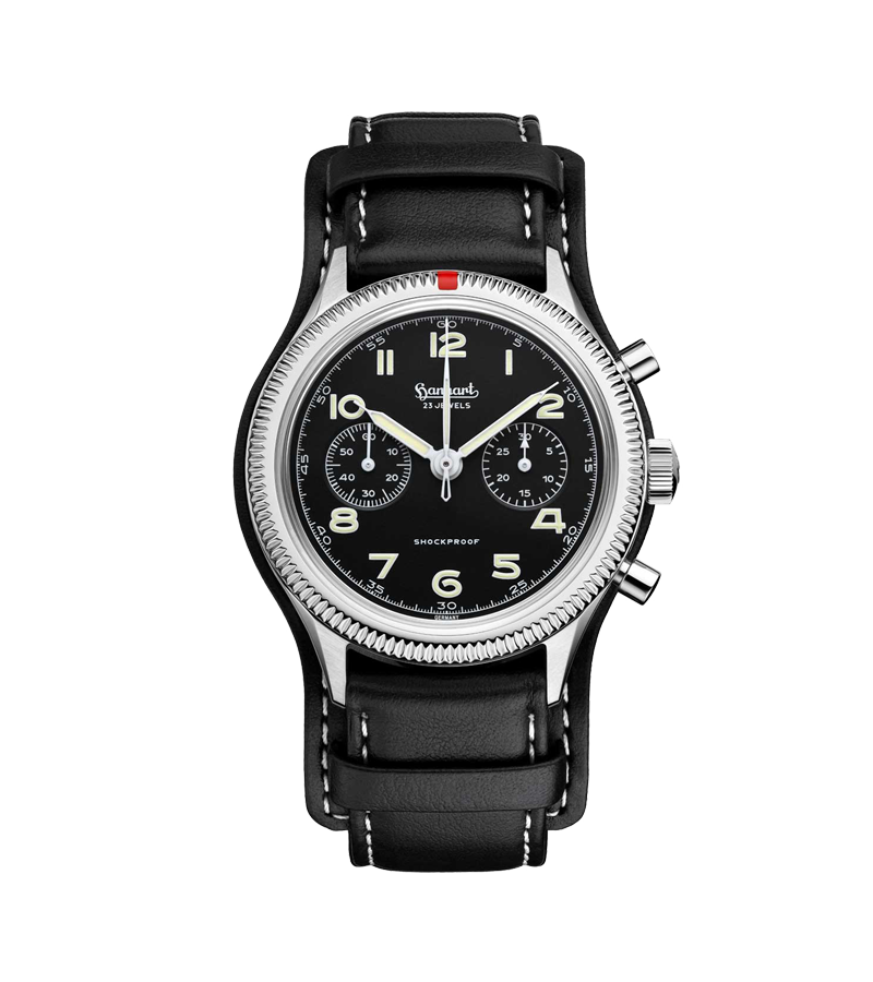 第二次世界大戦後、ウィリー・ハンハルトは特別戦争罪から速やかに無罪と下され、新たに成立したドイツ・バーデン=ヴュルテンベルク州に帰還します。戦後の混乱により、HANHARTの製造は1945年から1948年まで一時中断を余儀なくされましたが、1948年には再びパイロットクロノグラフの製造を再開。フランスの依頼により製造された「アドミラル」クロノグラフは、医師や将校向けに開発された特別なモデルとして注目を集めました。さらにドイツ海軍にも高精度な計時機器が供給され、ブランドの技術力が改めて評価されることとなります。1950年代初頭には、製造体制が本格的に回復し、機械式ストップウォッチの製造に注力。「Sans Souci(サンスーシ)」と名付けられた腕時計やタイマーなど、数々の革新的な製品が次々と世に送り出されていきました。
