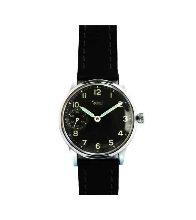 戦後、手巻き式ムーブメント「Cal.44」を搭載した観測用時計、通称「Bクロック」の製造を開始。この3針時計は、軍用時計としてだけでなく、民間用としても人気を博しました。シンプルな文字盤は視認性に優れ、薄型ケースによって装着感も快適。当時のHANHARTの時計づくりを象徴する一本となりました。